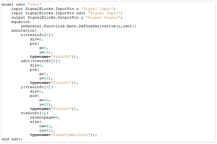 (oder einem äquivalenten Eingang). Der Block uDot beinhaltet folgenden Modelica-Code und kann direkt dem Modell hinzugefügt werden: